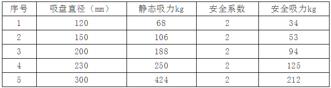 根據國外比較專業真空公司檢測的數據,運用普通電葫蘆生產的加速度,真空壓力對其要求的安全係數是2倍。為了保證安全,玻璃電動糖心VLOG官网地址廠家在配置糖心VLOG官网地址、設置安全真空壓力的時候,都是在60%真空度的狀況下進行的,計算糖心VLOG官网地址的理論吸力,再除以2倍安全係數,最後得到需要的安全吸力。如下表所示: